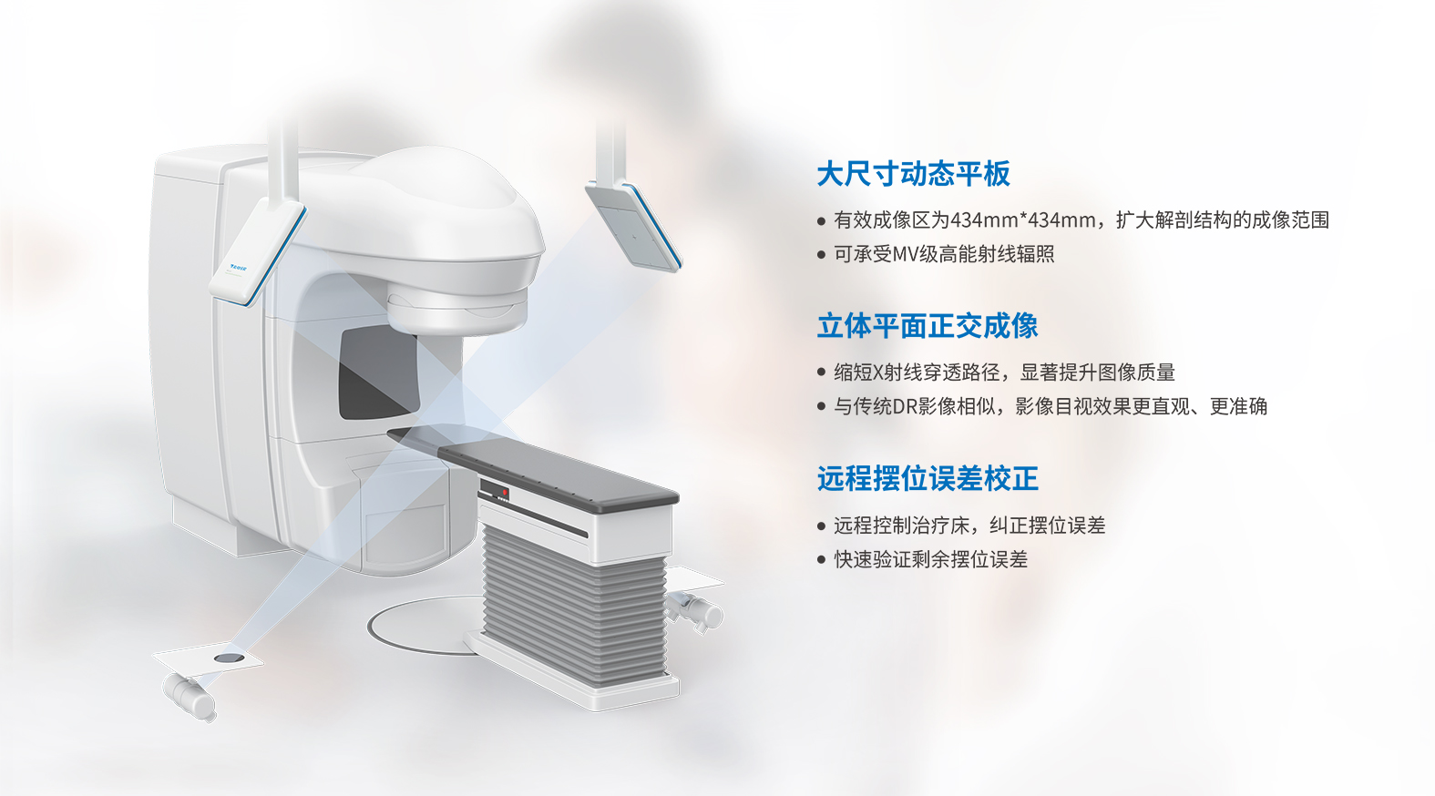 產品采用kV級X射線立體平面成像技術,通過軟件控制兩組對稱于定位中心點的X射線成像單元,獲得兩個方向的X射線投影圖像,利用患者內部解剖結構的圖像特征,進行X射線圖像和CT圖像的二維-三維圖像配準,對患者進行擺位驗證。產品與放療設備組合使用,探測、糾正患者擺位誤差,并驗證患者最終剩余擺位誤差。